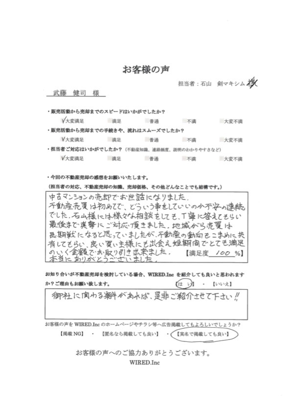 不動産売買は初めてで、どういう事をしていいのか不安の連続でした。石山様には様々な相談をしても、丁寧に答えてもらい最後まで真摯にご対応頂きました。地域がら売買は長期戦になると思っていましたが、不動産の動向もこまめに共有してもらい、良い飼い主様にも出会え短期間でとても満足のいく金額でお取り引き出来ました。本当にありがとうございました。